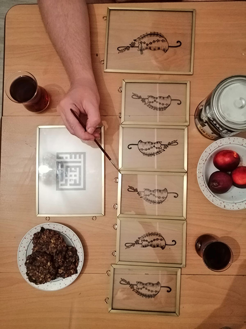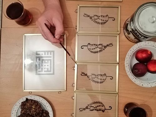 Pirinç çerçevelerimizde özellikle cam üzerine siyahı tercih ediyoruz çünkü siyah ve gold rengin uyumuna ve asaletine çok güveniyoruz. Bulunduğu ortama şıklık katan detayların, bu uyumla yakalandığına inanıyoruz. Fakat bizim için bu işi sadece ticaret veya sadece sanat olarak yapmanın çok daha ötesinde bir anlam var. Her anlamı var eden, her anlamın yegane sahibi olan O (c.c)’nu ve O (c.c)’ nun bize ulaştırdığı her sözü, emri, vaadi ve uyarıyı çalışmalarımıza ekleyerek hat sanatının estetiği ile yoğurarak tüm anlamların en yücesini yaşam alanlarında yer alacak şekilde tasarlamış oluyoruz.