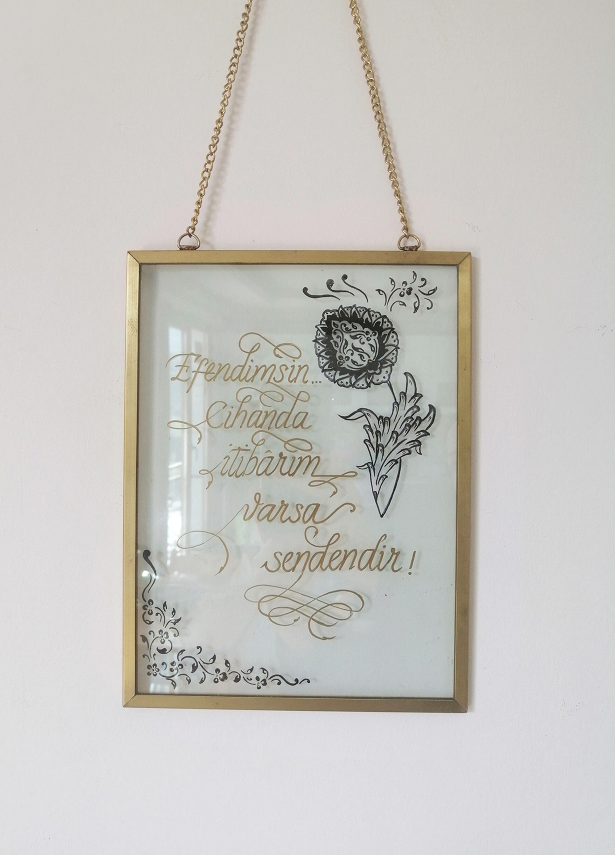 "Efendimsin; cihanda itibarım varsa sendendir." Türkçe kaligrafi ile yazılmış ve tezhip detayları ile süslenmiş olan özgün çalışmamız, alemlere rahmet efendimiz (s.a.v) için naat niteliği taşımaktadır. Çalışmalarımız hiçbir şekilde silinmez, ömürlüktür. Tamamen el yapımıdır. Hakiki pirinç çerçevelerimiz zamanla antika görünümüne kavuşur. (Özel detaylandırmalar ve tablo ölçülerinde değişiklik için Whatsapp butonundan iletişime geçebilirsiniz)